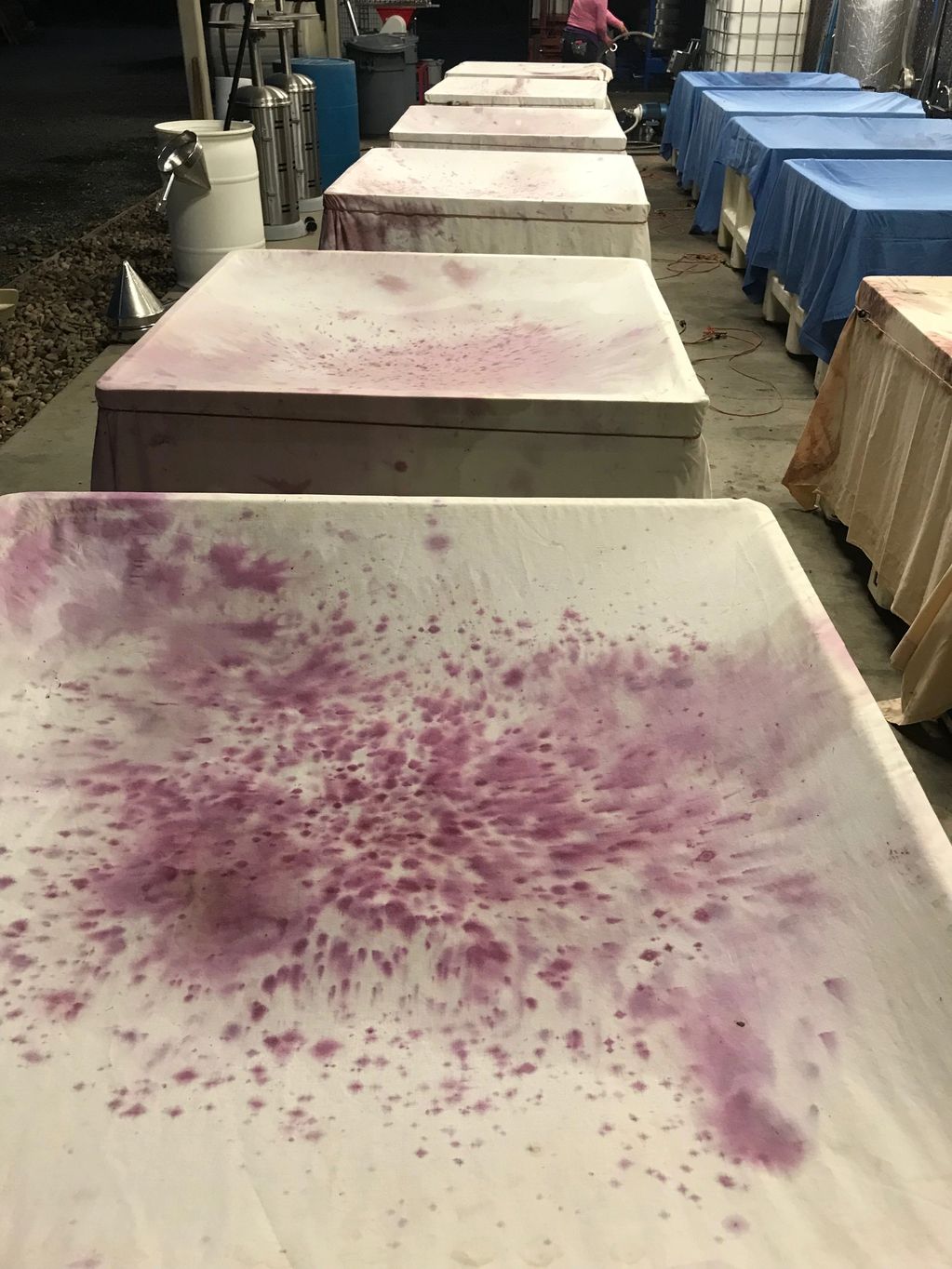 Because wine making is an active and dynamic process, where grape juice is bubbling and foaming, the sheets invariably get stained.